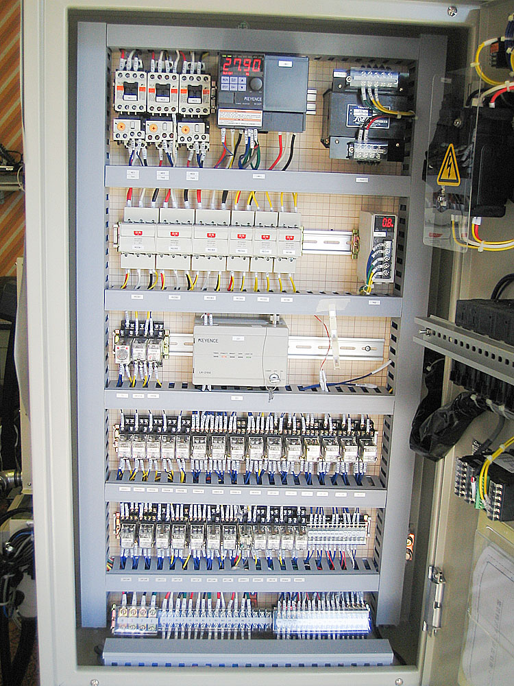 電装は協力会社と共に内容を調整しながら制御盤を作り込みます。
